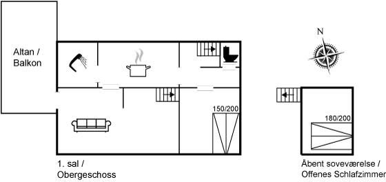 Phantastische 50 m² große Ferienwohnung im echten Skagenstil mitten im attraktiven Østerby, 250 m vom beliebten Sønderstrand entfernt. Die Ferienunterkunft wurde 2021 komplett renoviert. Die Wohnung liegt im Obergeschoss mit Fenstern zum Østerbyvej, eine der beliebtesten Straßen in Skagen. Vom Wohnzimmer aus haben Sie Blick auf die Schiffe im Hafen und die charakteristischen gelben Häuschen von Østerby. Bis zum beliebten Sønderstrand sind es 250 m und nur wenige hundert Meter bis zum Hafen, Ortskern und den restlichen Attraktionen des Orts. Zudem sind es 300 m bis zum Vippefyr, 200 m bis Brøndums Hotel und dem Kunstmuseum Skagens Museum. Die nächste Einkaufsmöglichkeit für den täglichen Bedarf ist 700 m, andere Geschäfte bereits 350 m entfernt. Das Haus eignet sich für 4 Personen. 2 Schlafplätze befinden sich in einem Schlafzimmer und 2 Schlafplätze in einem offenen Schlafzimmer. Eine Treppe im Wohnzimmer führt in das offene Schlafzimmer hinauf. Von hier oben haben Sie Blick auf das Meer, den Hafen und den größten Teil von Østerby. Vom Wohnzimmer gelangt man auf eine große Dachterrasse von 14 Quadratmetern mit Loungemöbeln und Esstisch mit 4 Stühlen. Die Küche ist mit einem Kühlschrank mit Gefrierfach ausgestattet. Es sind ein Induktionsherd, ein Umluftbackofen und eine Spülmaschine vorhanden. Es gibt ein großes Badezimmer mit Duschnische und eine separate Toilette mit Waschbecken. Zur Wohnung gehört ein Parkplatz. In der Ferienunterkunft gibt es ein Smart-TV. Fernsehsender werden über das Internet empfangen, WLAN steht zur Verfügung. 1 Bluetooth-Lautsprecher. Es ist erlaubt 1 Haustier mitzubringen.