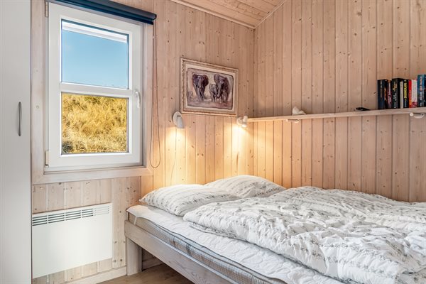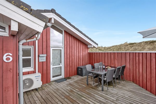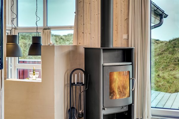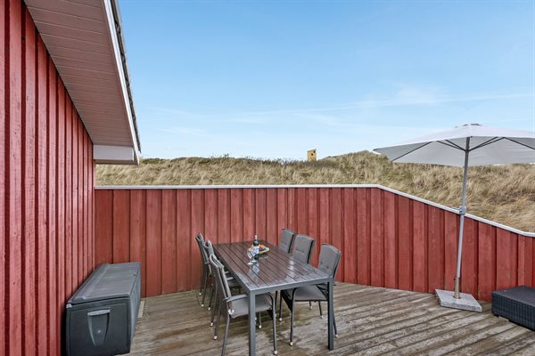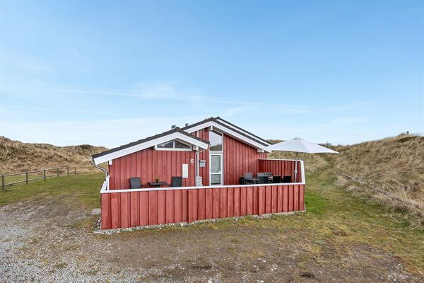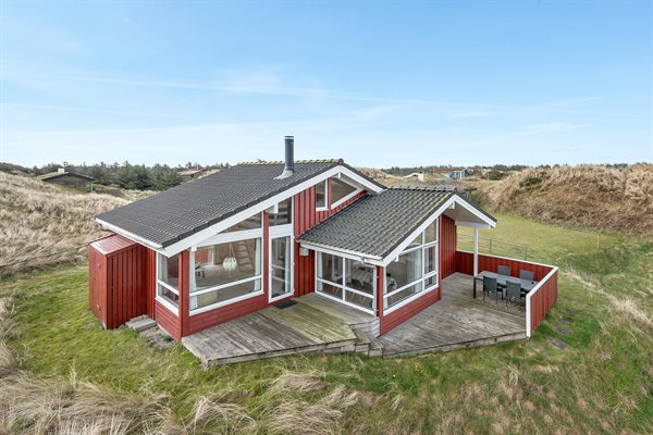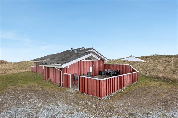 Sehr schönes Ferienhaus auf einem Dünengrundstück gelegen, nur 400 m von einem der besten Badestrände Dänemarks entfernt. Vom Wohnzimmer im offenen Obergeschoss Aussicht auf die mit Heide bewachsenen Dünen und auf die Nordsee. Naturschutzgebiet vor dem Haus. Das Haus ist mit 2 hübsch möblierten Wohnzimmer eingerichtet; 1 in versetzter Ebene und 1 im offenen Obergeschoss.