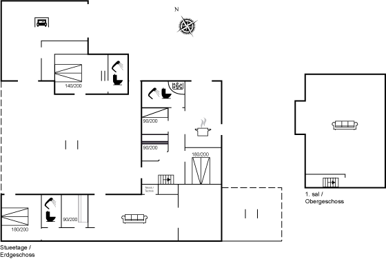 An der Zufahrt zum breiten Sandstrand in Blokhus liegt dieses große Ferienhaus zentral im Verältnis zum Stadtleben und zum Strand. Ein guter Ort für die große Familie mit herrlichem Blick auf den Strand und das Wasser von Obergeschoss des Hauses aus. Das Haus ist in 3 Einheiten aufgeteilt (siehe Grundriss), so dass zwischen den Häusern ein ungestörter Innenhof entsteht, in dem man viele Stunden im Freien genießen kann. Das Haus, das in den letzten Jahren einer umfangreichen Renovierung unterzogen wurde, präsentiert sich hell und einladend. Es gibt auch ein Gästehaus, das mit einem Schlafzimmer und eigenem Badezimmer ausgestattet ist. Der Ferienort Blokhus bietet Restaurants, Cafés und Einkaufsmöglichkeiten sowie einen gemütlichen Marktplatz an.