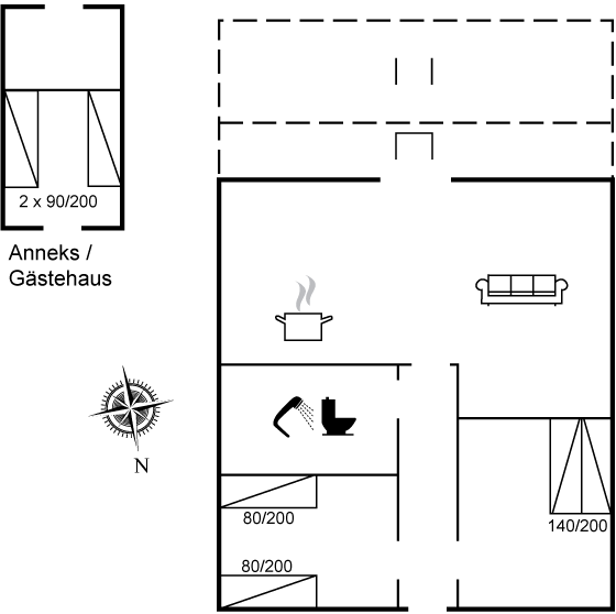 Zum Haus gehört ein Gästehaus, das mit zwei Einzelbetten und einem Schrank eingerichtet ist. Im Gästehaus findest du auch eine Waschmaschine und einen Wäschetrockner.
