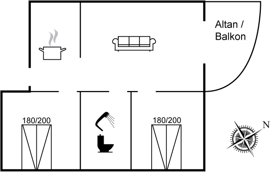Die Ferienwohnung mit neuer Küche liegt im 1. Stock und hat 2 Balkons, mit direktem Meeresblick nur 100 m vom Kattegat, mit seinem kinderfreundlichen Sandbadestrand entfernt. Draussen gibt es Spielplätze mit Rasen, Schaukel, Rutsche und Sandkasten.