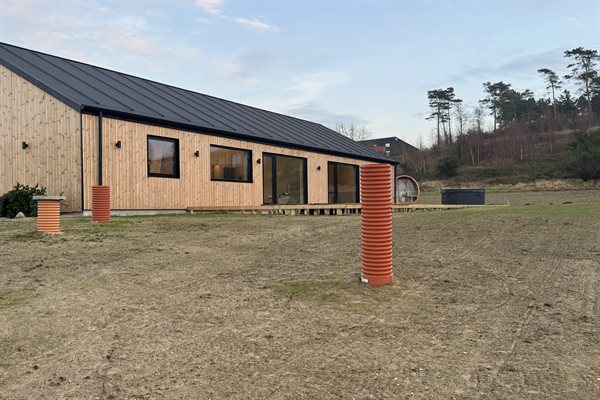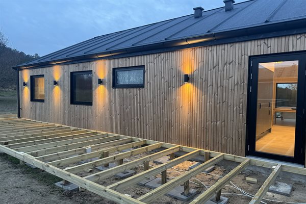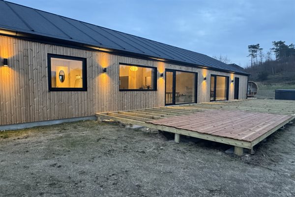 Wunderschönes und 2026 neu gebautes Ferienhaus mit Fassaden aus hellem Holz und dunklen Fenstern.