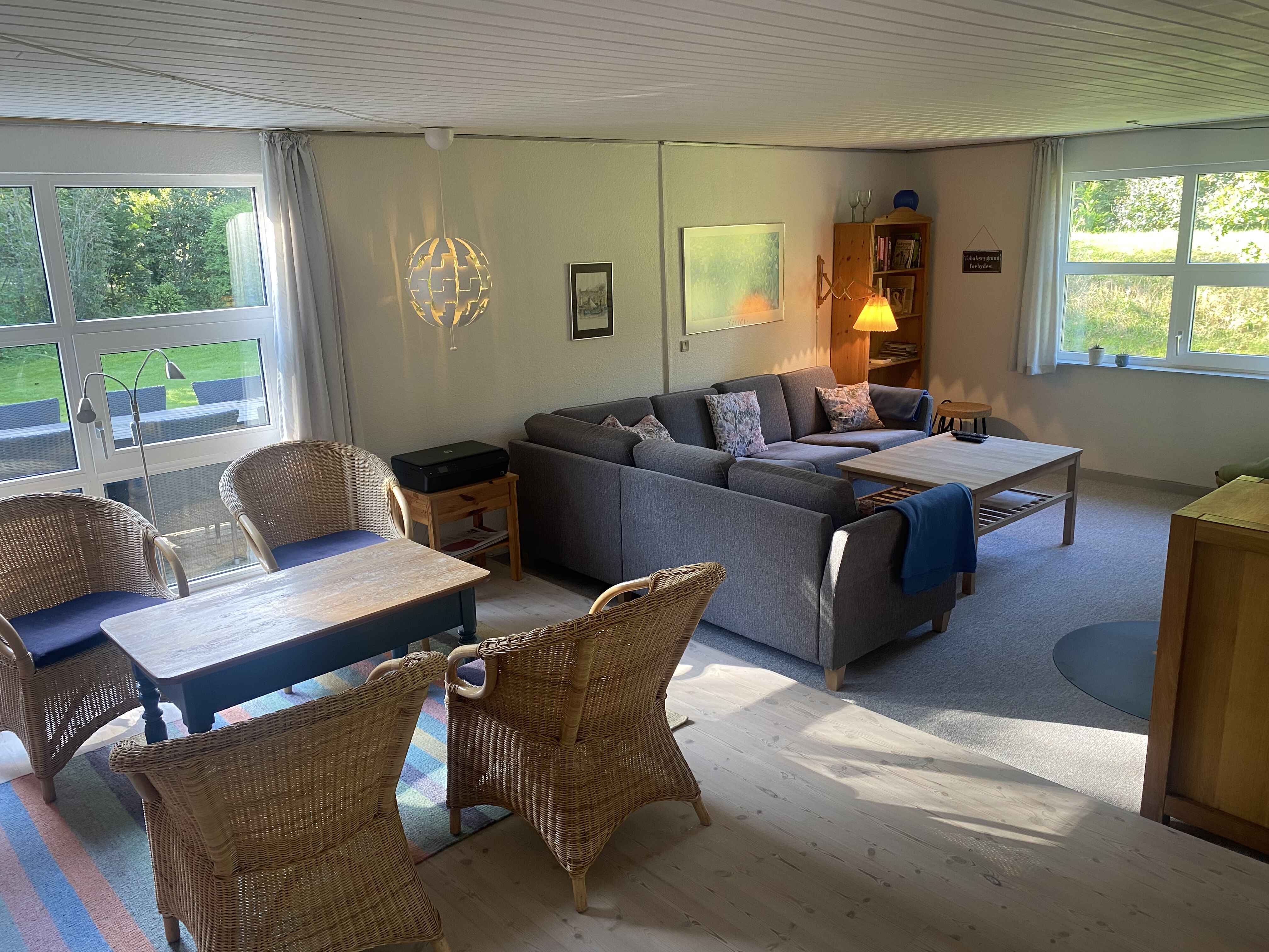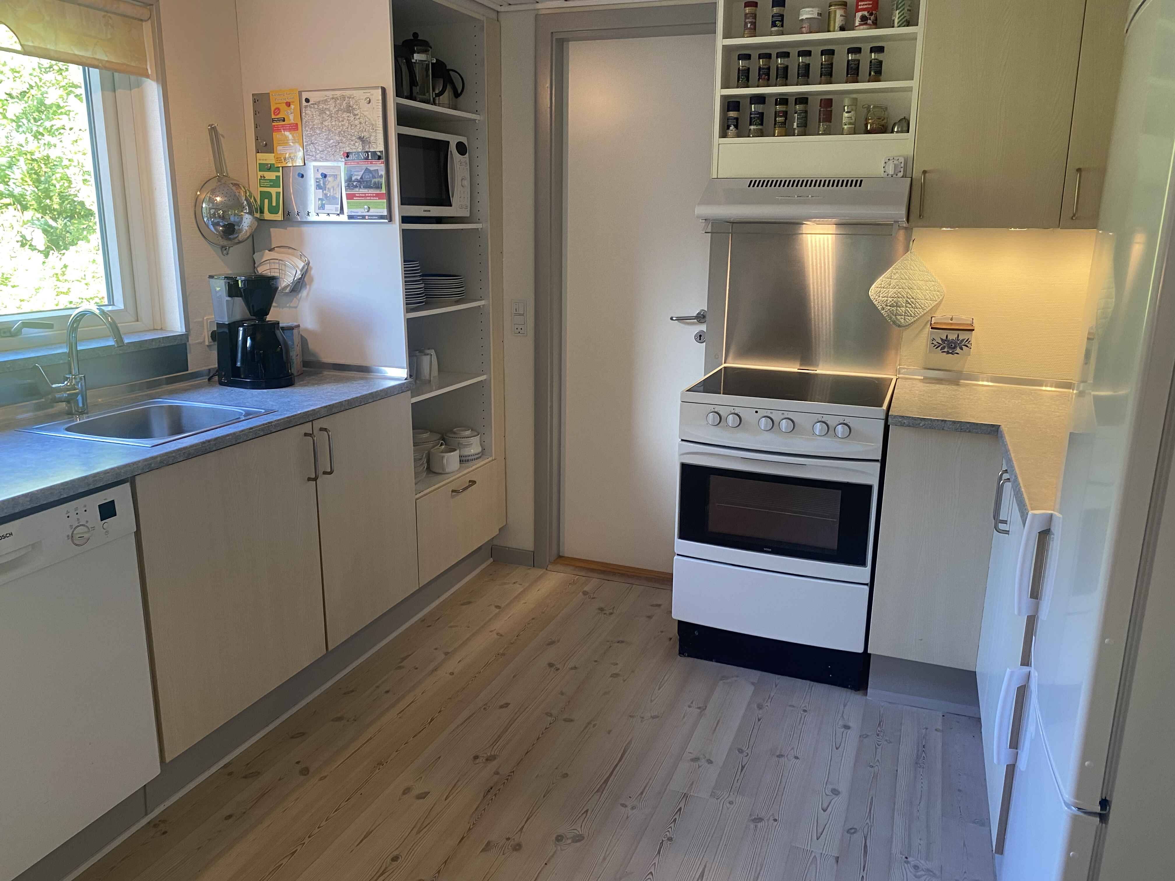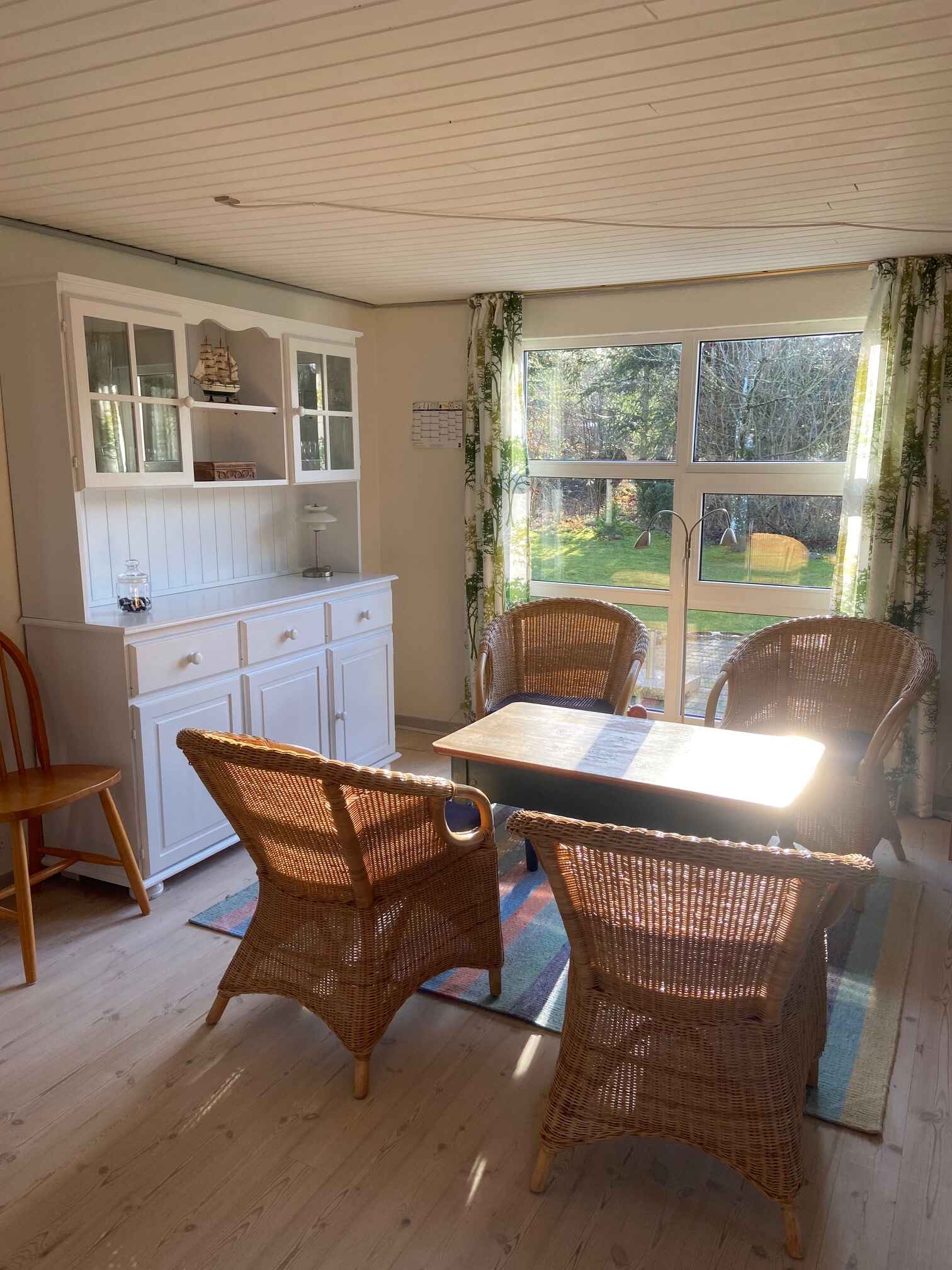 Huset har et dejligt køkken med opvaskemaskine i åben forbindelse med en praktisk spiseplads og med stuen, der er indrettet mig en stor hjørnesofa, som familie kan hygge sig i foran fjernsynet. Skal der spilles brætspil, han der også et “spillebord” med kurvestole omkring. Familier kan være sammen, og de kan også hygge sig med aktiviteter. Den fyrer og har varmepumpe.